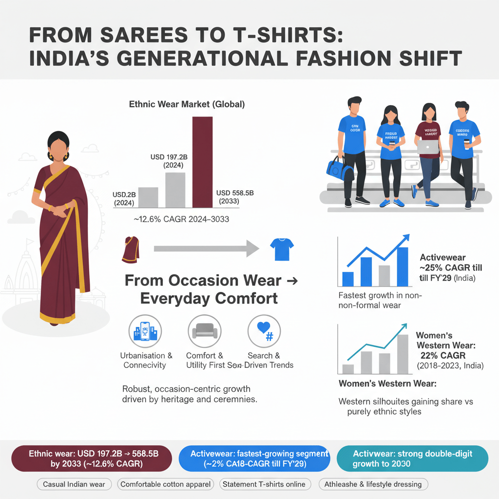 The effects of this massive generational fashion shift continue to play out on social platforms, where visibility depends entirely on aligning with lifestyle content, whether focused on fitness, travel, or parenthood. In conclusion, the journey from Sarees to T-shirts should be viewed not as a tale of replacement, but one of inclusion. The Saree will always hold its irreplaceable niche, especially within festive and ceremonial segments. However, the commercial volume, the scale of daily demand, and the dominant search interest now squarely belong to casual Indian wear, comfort-centric clothing, and highly specific, niche-focused statement t-shirts online.